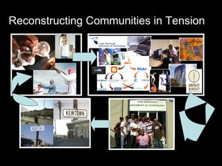 The document discusses the Athlone Living Lab project which aims to reconstruct community spaces in the Athlone area of Cape Town, South Africa using innovative ICT solutions. The project focuses on using technology to care for, inform, and educate citizens as well as support enterprise development. It seeks to create an interaction space where the university, community, and industry can collaborate on developing knowledge and solutions that empower and develop the local community. Key stakeholders involved include universities, community organizations, and technology companies. The document outlines how projects and services could be embedded within the Athlone Living Lab.