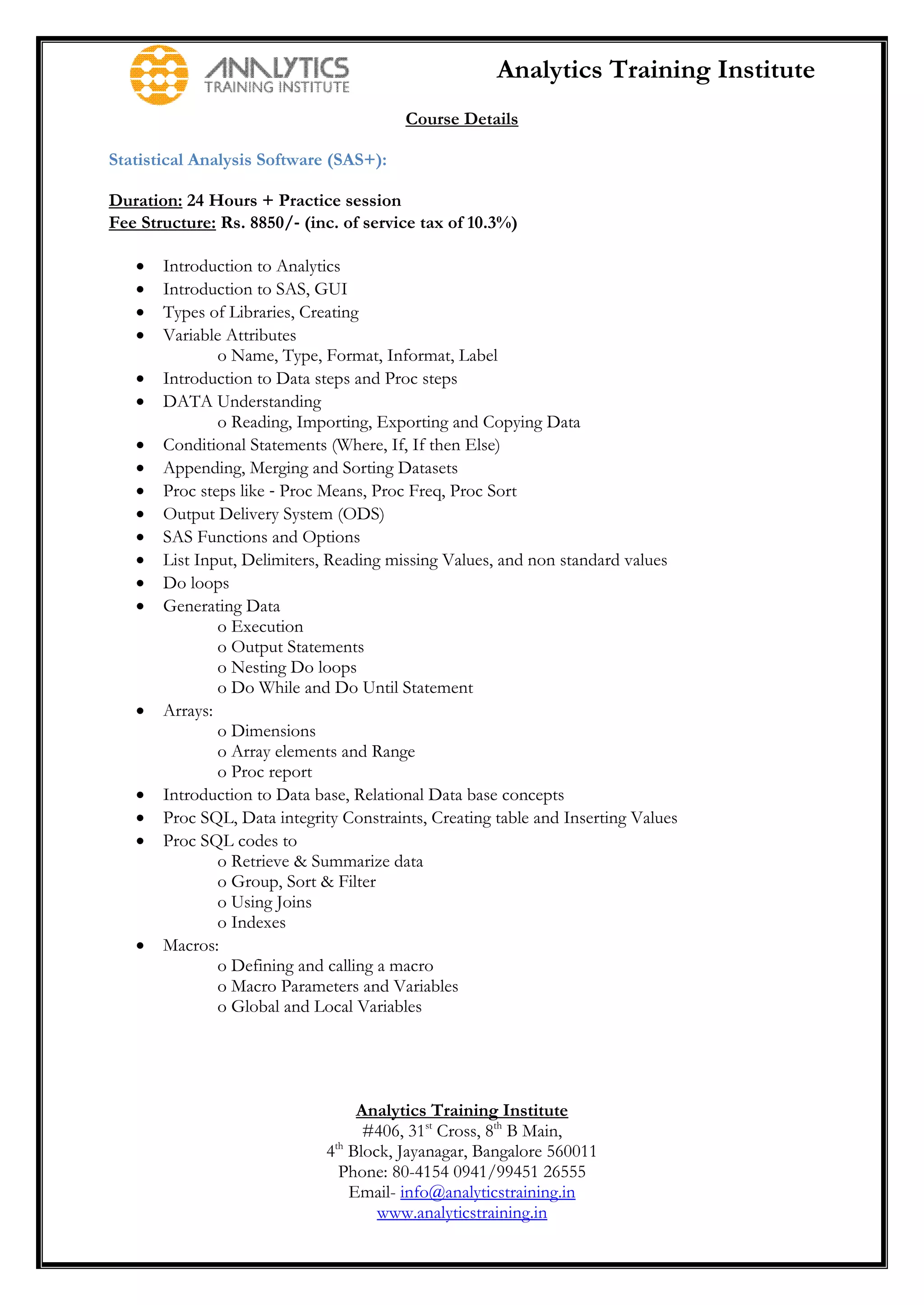 The document provides details about various analytics courses offered by Analytics Training Institute. It lists courses in Statistical Analysis Software (SAS), Excel Programming, Advanced Analytics, Excel for Financial Modeling, and Strategic Marketing Analytics. Each course description includes duration, fees, and topics to be covered. Package courses combining multiple individual courses are also offered at discounted prices.