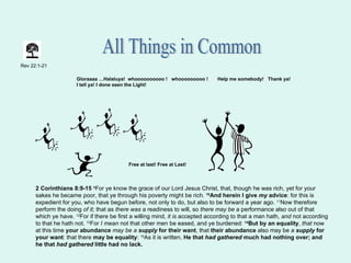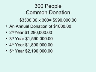 The document discusses various biblical passages and financial concepts. It presents data on donations, debt reduction, savings, investments and returns over time. It advocates using group purchasing power and negotiating with banks to acquire real estate assets like storage facilities and driving ranges through financing and notes.