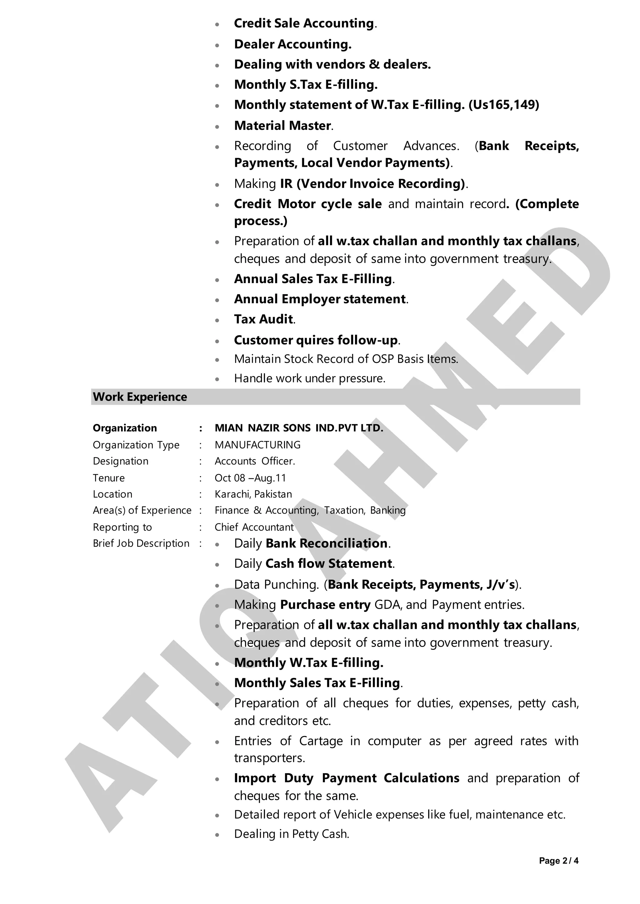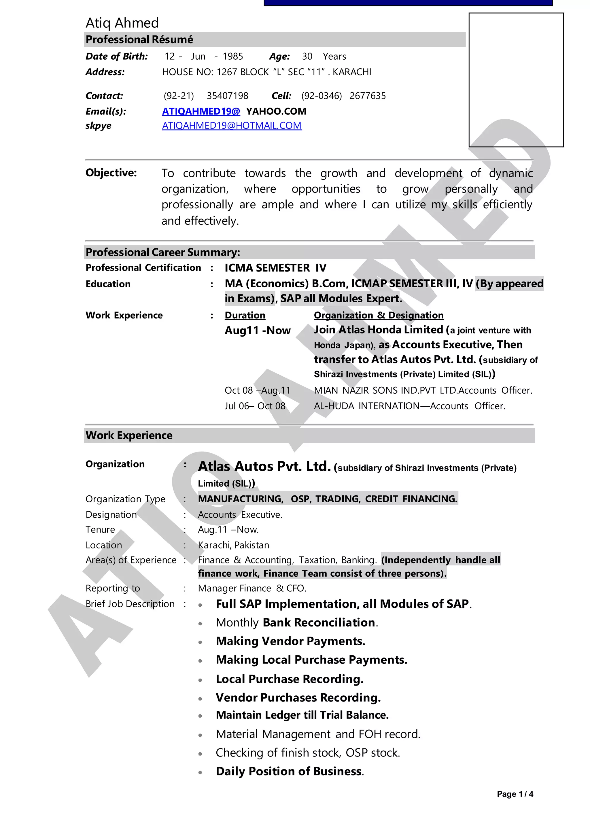 Atiq Ahmed is seeking a position that allows him to utilize his skills in finance, accounting, taxation, and banking. He has over 10 years of experience in these areas. Currently, he works as an Accounts Executive at Atlas Autos Pvt. Ltd., where he handles all finance functions including full SAP implementation, monthly reporting, vendor payments, and customer accounts. Previously, he held accounting roles at Mian Nazir Sons Ind. Pvt. Ltd. and Al-Huda International, gaining experience in areas such as bank reconciliation, tax filings, and stock management. Atiq has a MA in Economics and is pursuing further certification in accounting. He is proficient in Microsoft Office, SAP modules, and has