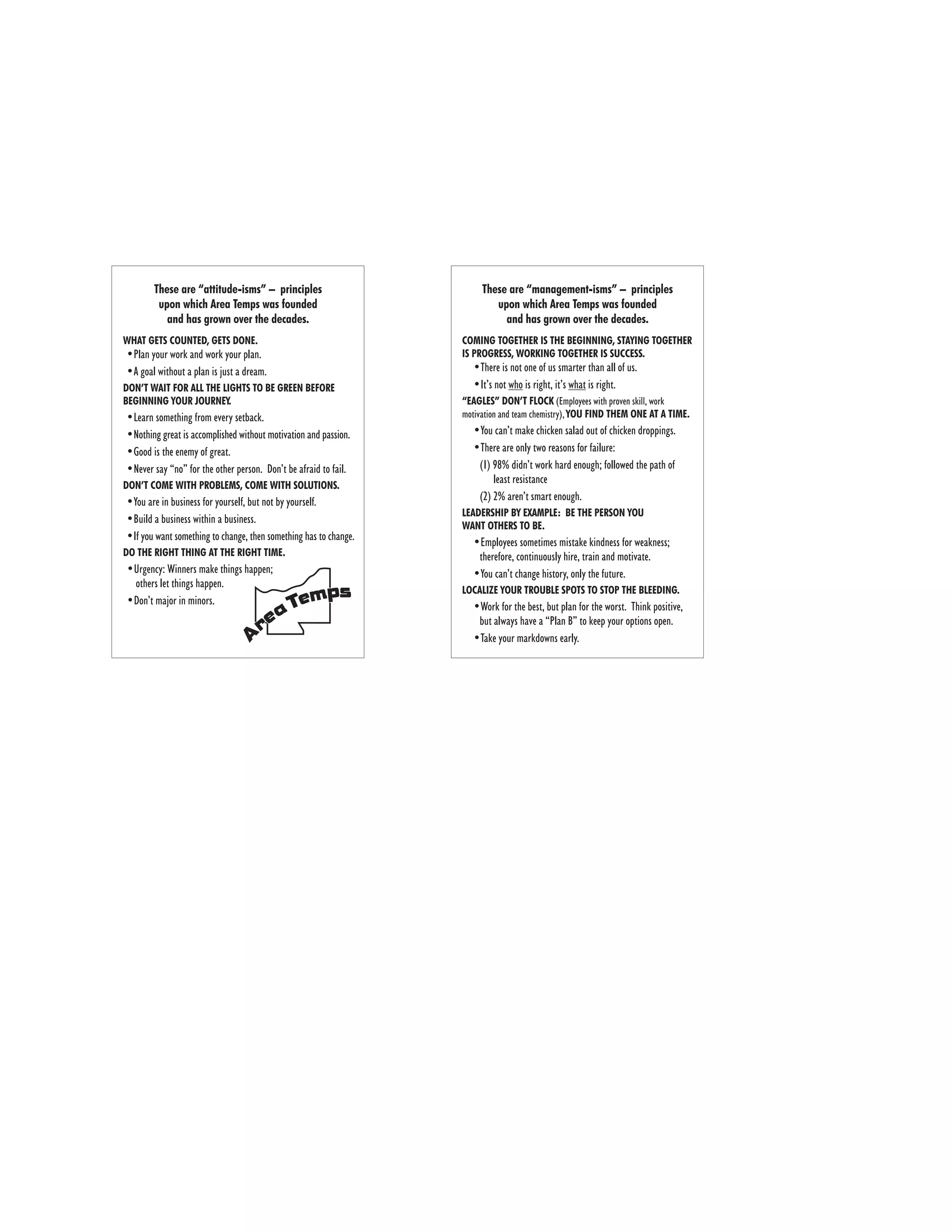 These principles outline the philosophy that Area Temps was founded upon and has used to grow over decades. The principles emphasize the importance of planning, teamwork, leadership, and doing the right thing. They promote taking initiative, owning failures, and focusing on solutions rather than problems.