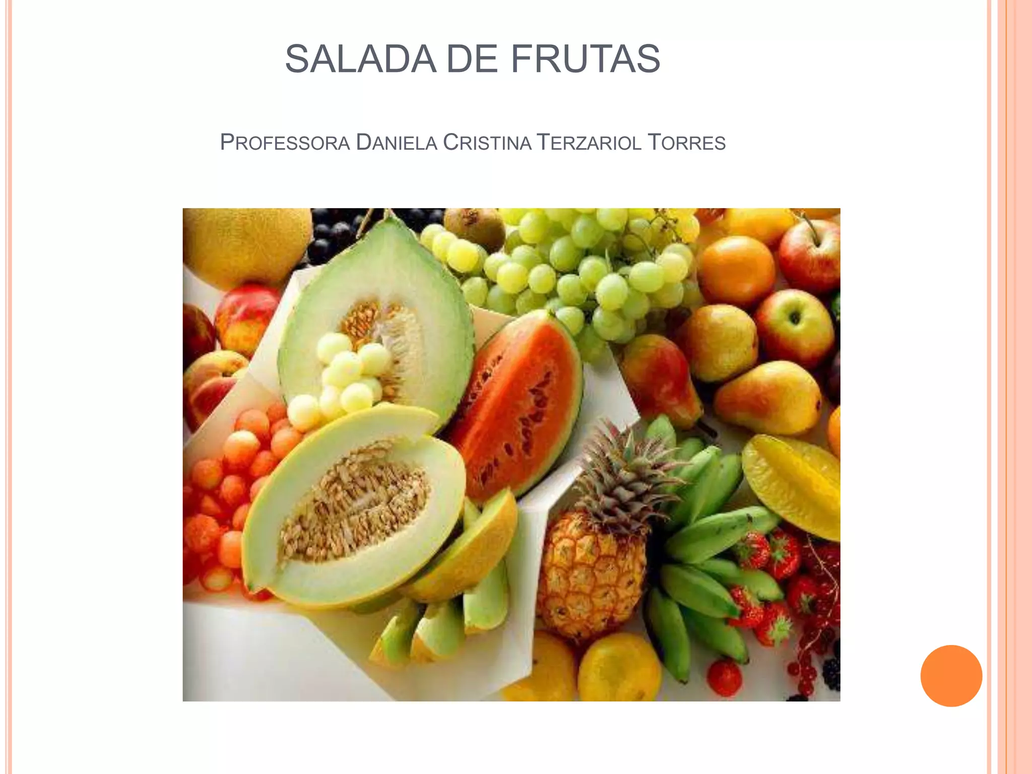 This document outlines an activity to make a fruit salad. The objectives are to learn about plant diversity and develop observation, classification, experimentation, and oral language skills. The activity is aimed at 4-5 year old children. It will involve using different fruits, their seeds, and assembling the fruit salad. References to learning materials and images are provided.