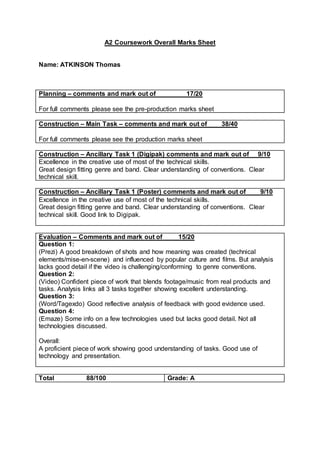 Thomas Atkinson received high marks for his A2 coursework. He scored 17/20 for planning, 38/40 for his main construction task, and 9/10 each for his two ancillary construction tasks of a digipak and poster. In his evaluation, he provided a good analysis that linked his three tasks together, showing an excellent understanding. His overall work showed a good understanding of the tasks and received a total score of 88/100, earning him a grade of A.
