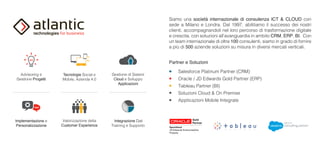 Atlantic Technologies è una società di consulenza ICT e cloud che supporta le aziende nella trasformazione digitale e nella crescita dal 1997. Offrono soluzioni personalizzate in CRM, ERP e BI, avvalendosi di un team internazionale di oltre 100 consulenti e collaborando con partner di prestigio come Salesforce e Oracle. Hanno assistito con successo oltre 500 aziende in vari mercati verticali grazie alla loro expertise in integrazione di sistemi e gestione della customer experience.