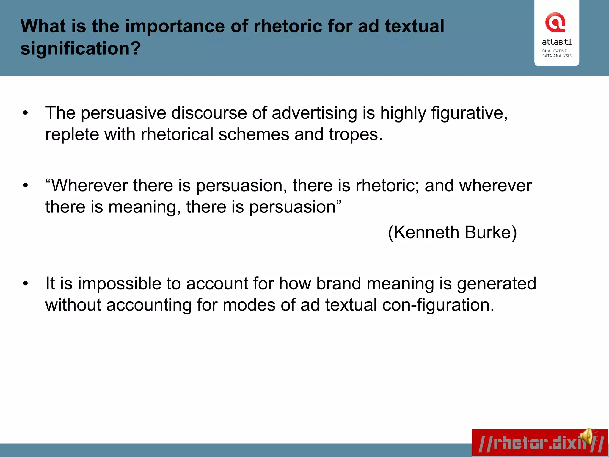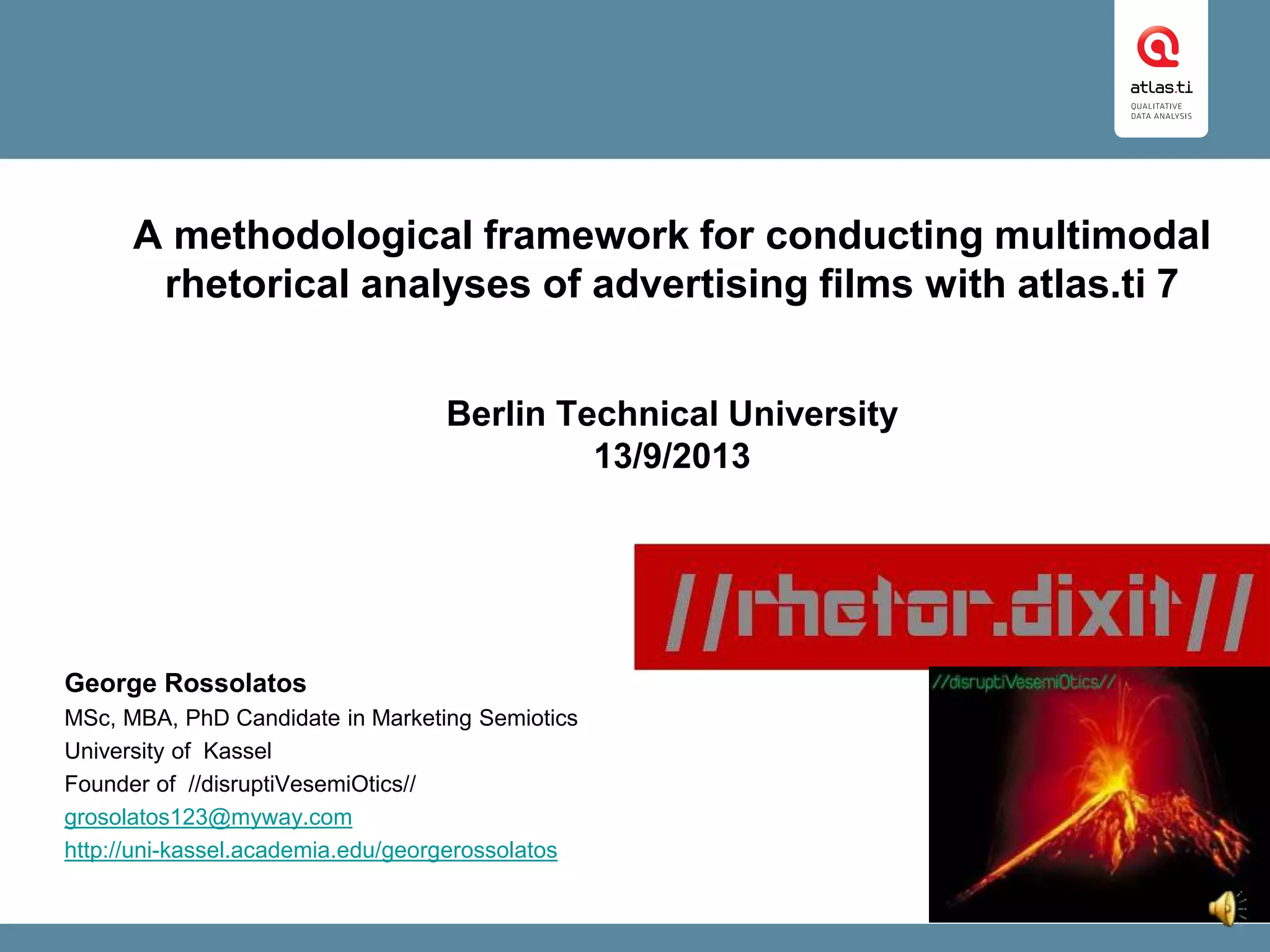 The document presents a methodological framework called //rhetor.dixit// for conducting multimodal rhetorical analyses of advertising films using atlas.ti software. This framework provides a systematic approach to dissect ad films segment-by-segment, emphasizing verbo-visual interactions and the generation of brand meaning through rhetorical figures. Key findings from analyzing 87 commercials reveal the predominance of adjunction operations among rhetorical figures, supporting strategic brand communication planning.