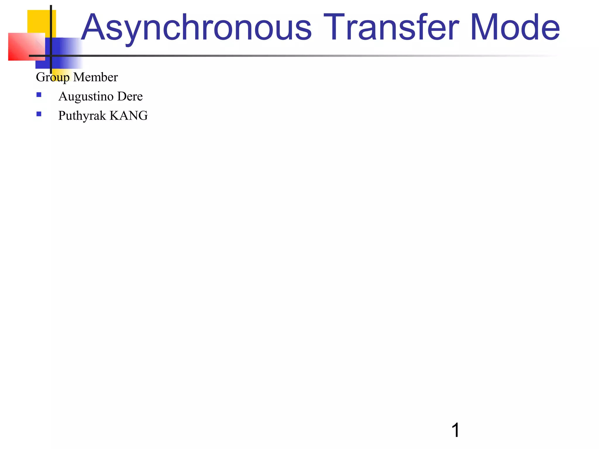 Asynchronous Transfer Mode (ATM) is a cell-switching and multiplexing technology that uses fixed-length packets called cells to carry different types of traffic like voice, video, and data. ATM works by segmenting data into these fixed-size cells which are then transmitted through virtual connections set up across an ATM network and reassembled at their destination. It provides benefits like high performance, Quality of Service guarantees, and the ability to handle different traffic types.