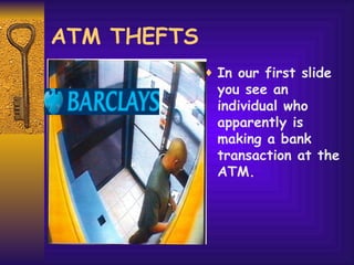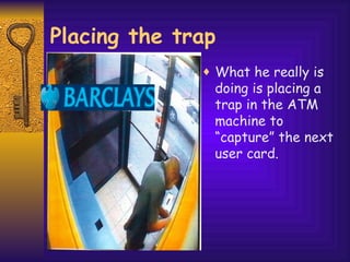 The document describes how ATM thieves are able to steal cards and PIN numbers from unsuspecting victims. It explains that thieves place a transparent film trap inside the ATM card slot before the next user inserts their card. This trap confiscates the card without the victim's knowledge. An accomplice then pretends to help the confused victim, trying to get them to reveal their PIN number. With both the card and PIN, the thieves are able to withdraw money from the victim's account before escaping. The transparent film trap is difficult to detect but can be removed to recover a confiscated card.