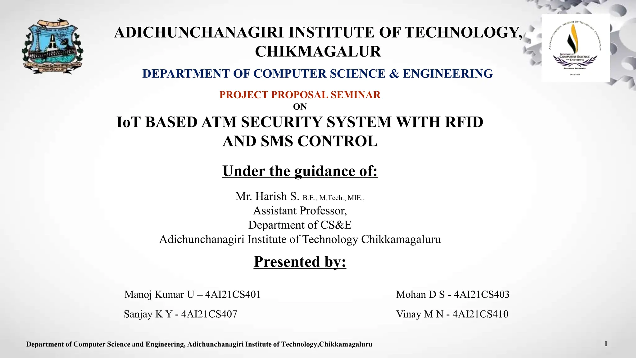 This document presents a project proposal for an IoT-based ATM security system using RFID and SMS control. The system utilizes RFID authentication for secure access control to the ATM and allows security officers to remotely control and monitor the ATM through a GSM module. It incorporates gas/smoke sensors to detect suspicious activities. The system aims to provide cost-effective and flexible security for ATMs located in isolated areas by enabling remote management through SMS commands.