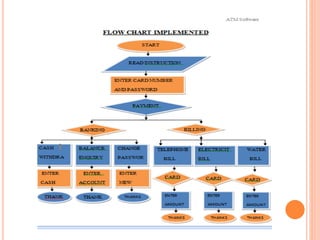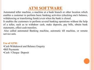 The document outlines the functions and objectives of Automated Teller Machines (ATMs), which allow customers to perform banking activities like cash withdrawals, bill payments, and fund transfers without teller assistance. It discusses the user experience of ATM software, including login procedures and transaction options for different payment types, as well as the importance of linking theoretical knowledge with practical applications. The project aims to analyze strategic issues related to ATMs and provide insights into their structure and customer benefits.