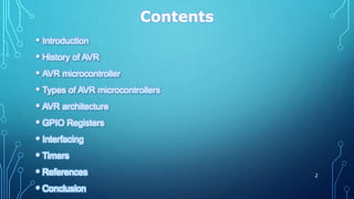 The document provides an overview of AVR microcontrollers, including their history, architecture, types, and common peripherals. AVR microcontrollers were developed by Atmel beginning in 1996 and use on-chip flash memory for program storage. They are available in three categories - Tiny, Mega, and Xmega - with the Mega being the most popular. The AVR architecture employs 32 general purpose registers, static RAM, EEPROM, flash memory, timers/counters, and I/O ports. Common peripherals that can be interfaced include LEDs, 7-segment displays, switches, DC motors, and LCDs. Timers and interrupts are also discussed.