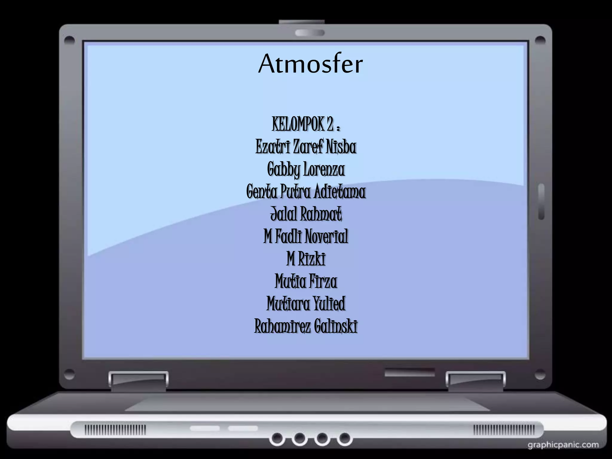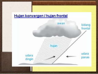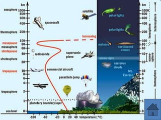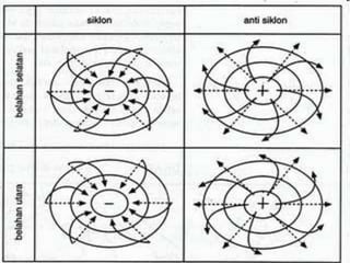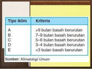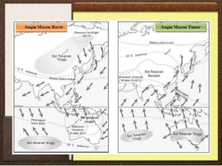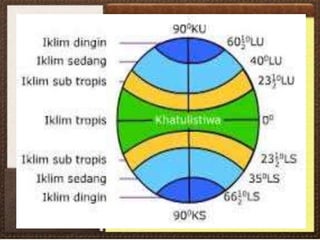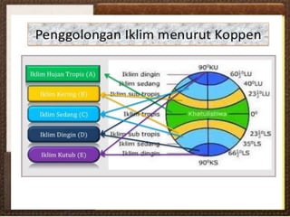 Dokumen ini membahas pengertian, struktur, sifat-sifat, dan manfaat atmosfer serta fenomena cuaca dan iklim. Ia menjelaskan berbagai lapisan atmosfer, faktor-faktor yang mempengaruhi suhu, kelembaban, dan angin, serta klasifikasi iklim menurut beberapa pakar. Selain itu, terdapat informasi tentang peran penting iklim dan cuaca dalam kehidupan sehari-hari serta tantangan yang dihadapi seperti pemanasan global.
