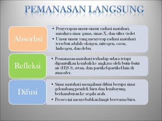 Dokumen ini membahas atmosfer Bumi, termasuk lapisan-lapisannya, suhu, serta dampaknya terhadap kehidupan, seperti penyebaran cuaca dan iklim. Atmosfer berfungsi menjaga suhu dan melindungi Bumi dari radiasi berbahaya, serta menyediakan gas-gas penting seperti oksigen dan karbon dioksida. Selain itu, dokumen ini menjelaskan prinsip-prinsip meteorologi, termasuk pengukuran suhu dan tekanan udara, serta pengaruh tekanan terhadap pergerakan angin.