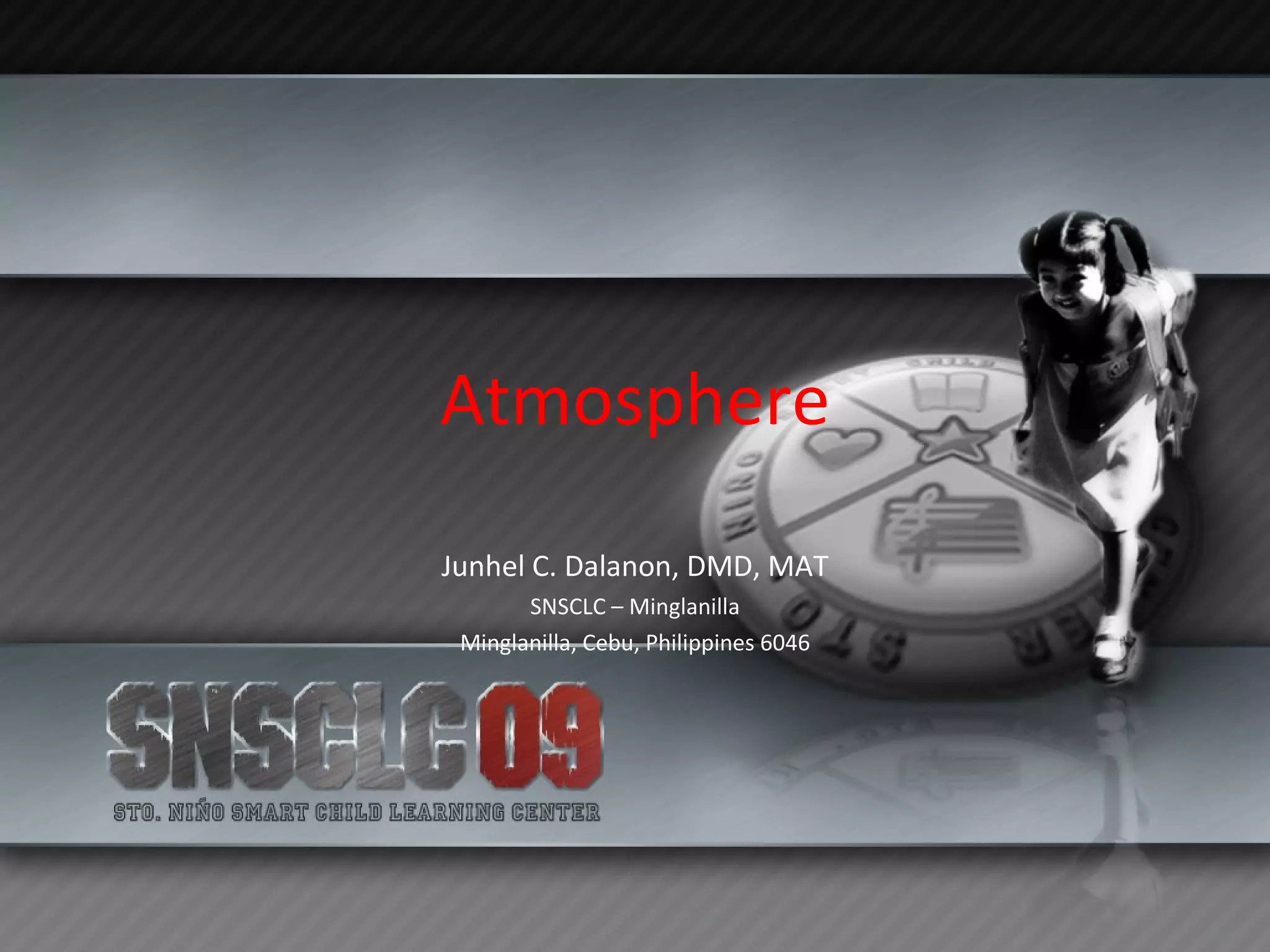 The document discusses the layers of the Earth's atmosphere. It is divided into 4 layers - the troposphere closest to the surface from 0-10 km, the stratosphere from 10-25 km containing the ozone layer, the mesosphere from 25-100 km, and the thermosphere the highest layer from 100-400 km where meteorites burn up. The atmosphere contains nitrogen, oxygen, argon, carbon dioxide and other gases, with nitrogen being the most abundant.