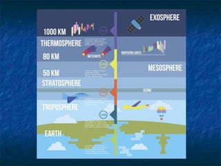 - The atmosphere is divided into five main layers - troposphere, stratosphere, mesosphere, thermosphere, and exosphere - with varying temperature and air pressure profiles.