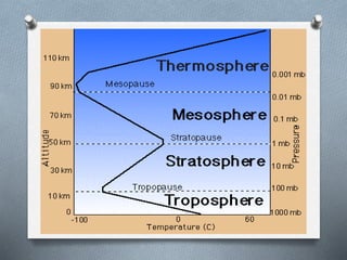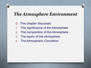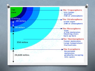 This document explores the atmosphere's significance, composition, and layers, including the troposphere, stratosphere, mesosphere, thermosphere, and exosphere. It details the interactive nature of Earth's systems—atmosphere, hydrosphere, biosphere, and geosphere—and discusses weather and climate factors such as temperature, humidity, and air pressure. Additionally, it highlights the mechanisms of heat transfer and the role of gases in shaping weather and climate patterns.