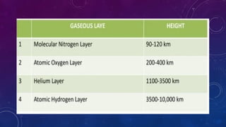 The document provides a comprehensive overview of the Earth's atmosphere, detailing its definition, composition, and structure, which includes layers like the troposphere, stratosphere, mesosphere, thermosphere, exosphere, and magnetosphere. Key components such as gases, water vapor, and dust particles are discussed, highlighting their roles in weather phenomena and environmental processes. The conclusion emphasizes the complexity of atmospheric layers and the need for further research in understanding them.