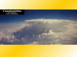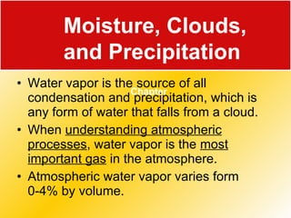 Water vapor is the most important gas in the atmosphere and is the source of all condensation and precipitation. The water cycle begins with evaporation and includes condensation, precipitation, and water running off or sinking into the ground. Clouds are classified based on height and form, with cirrus, cumulus and stratus being the main types. For precipitation to form, cloud droplets must grow substantially through processes like the Bergeron process in cold clouds and collision-coalescence in warm clouds.