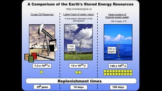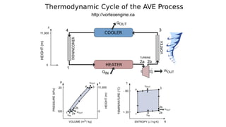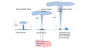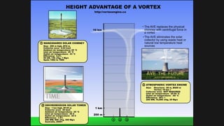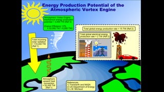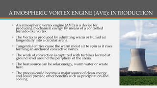 The atmospheric vortex engine (AVE) generates mechanical energy through a controlled tornado-like vortex created by warm, humid air entering a circular arena, capturing energy with peripheral turbines. The AVE can utilize waste heat as its fuel source and has the potential to provide significant benefits, including increased electricity generation and environmental cooling. Its development may enhance power capacity in thermal plants while reducing greenhouse gas emissions, although challenges in control and engineering remain.