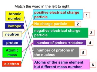 The document provides information about the fundamental particles that make up atoms, including protons, neutrons, electrons, and isotopes. It defines key atomic properties such as atomic number, which is the number of protons in an atom's nucleus, and mass number, which is the total number of protons and neutrons. It notes that atoms of the same element can have different numbers of neutrons, making them isotopes. As an example, it provides the particle makeup of several carbon isotopes: 12C, 13C, and 14C.