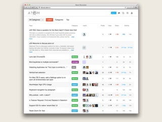 The document discusses the Atom text editor and its features. It notes that Atom is a hackable text editor for the 21st century, supports plugins and themes, and uses technologies like CoffeeScript, LESS, and CSON. The document also provides the Atom website URL and mentions that the editor supports features like publishing new versions and is open source.