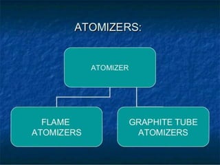 Atomic absorption spectroscopy is a technique used to detect metals and metalloids in samples. It works by atomizing the sample using a flame or graphite furnace and measuring the absorption of light from a hollow cathode lamp at specific wavelengths. Key components of the instrumentation include the lamp, atomizer, monochromator and detector. It can be used to analyze over 62 elements and is applied in areas such as environmental analysis, the food industry and pharmaceutical analysis.