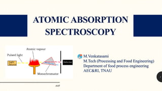 The document discusses Atomic Absorption Spectroscopy (AAS), an analytical method to measure mineral elements by their absorption of ultraviolet or visible radiation in a gaseous state. It details the principles of atomization, instrumentation, and operational procedures, highlighting the advantages of AAS over traditional methods for trace element analysis in food and other applications. Various atomization techniques and their components, including flame and electrothermal atomization, are described, alongside the role of hollow cathode lamps and monochromators in the process.