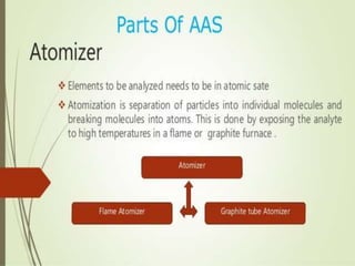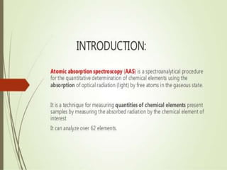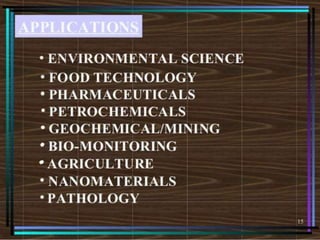 The document discusses atomic spectroscopy based on plasma sources. It introduces atomic spectroscopy and explains that it involves using plasma sources to produce excited atoms that emit electromagnetic radiation of characteristic wavelengths. The principle and instrumentation of atomic spectroscopy are described. Various applications of atomic spectroscopy are also mentioned, such as its use in chemical analysis. References are provided for further reading on the topic.