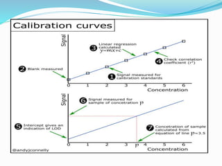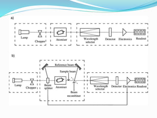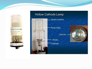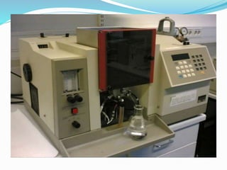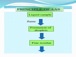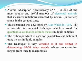 Atomic absorption spectroscopy is a technique used to determine the concentration of trace metals in liquid samples. It works by measuring the absorption of light by ground state atoms in a flame. The sample is atomized in the flame and specific elements absorb light from a hollow cathode lamp emitting their characteristic wavelength. The amount of light absorbed is measured and the concentration of the element determined using a calibration curve. AAS is a sensitive and selective method used widely in fields like environmental analysis, food testing, and clinical analysis to determine concentrations of metals like sodium, calcium, lead and zinc.