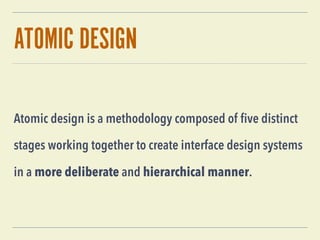 Atomic design is a methodology that structures interface design systems through five stages, facilitating deliberate and hierarchical design processes. Despite some drawbacks, such as complexity in adding new components and challenges for visual designers in mockups, it offers benefits like maximum component reuse, a unified design language for designers and developers, and increased productivity in creating new templates. The approach aims to streamline design and development, ultimately reducing routine tasks and focusing more on innovative features.
