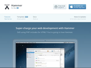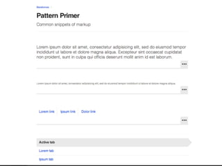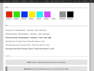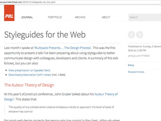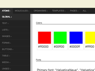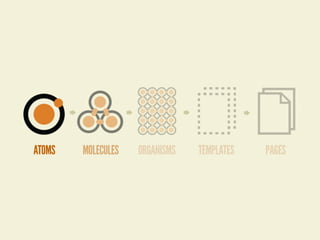 The document discusses the concept of Atomic Design in creating design systems, emphasizing the importance of components such as atoms, molecules, organisms, templates, and pages in the web design process. It highlights the benefits and challenges of front-end style guides and responsive deliverables while introducing Pattern Lab as a tool for building and maintaining these design systems. The author encourages a methodological approach to design, promoting consistency and collaboration among designers and developers.