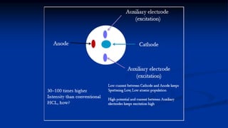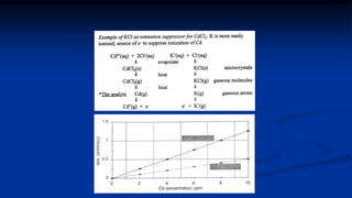Atomic fluorescence spectroscopy uses the same apparatus as atomic absorption spectroscopy but measures the emitted radiation from excited atomic species rather than absorbed radiation. It can determine the concentration of elements present using either line sources like lasers or hollow cathode lamps, or continuous sources like xenon arc lamps. Interferences can occur from chemical reactions interfering with atomization, ionization of analytes, overlapping spectra from other elements or molecules, and background emission or scattering. These issues can be addressed through techniques like chemical separation, modulation of the detector, and background correction methods.