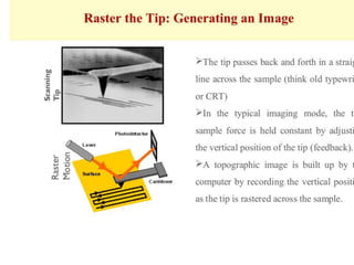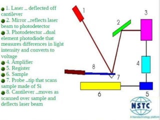 The atomic force microscope (AFM) was invented in 1985 by Gerd Binnig and Cristoph Gerber. It uses a sharp tip mounted on a flexible cantilever to scan the topography of a sample at an extremely high resolution down to the atomic level. The AFM works by measuring the interaction forces between the tip and sample surface. It consists of a probe with a sharp tip, a scanner that controls the tip's movement in the x, y, and z directions, and an optical lever system using a laser and photodetector to measure the cantilever's deflection. The AFM can image a variety of samples at the nanoscale and provide 3D topographic information.