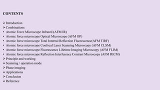 Atomic force microscopy (AFM) is a scanning probe technique capable of imaging surfaces at high resolution. AFM uses a sharp tip that feels the sample surface to detect sub-nanometer level changes. AFM can image samples in liquid and requires minimal sample preparation. The document discusses various combinations of AFM with other techniques like infrared spectroscopy, optical microscopy, and fluorescence microscopy. It also covers the basic principles, working, scanning modes, applications and advantages of AFM for imaging polymers and other materials.