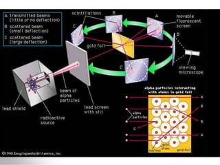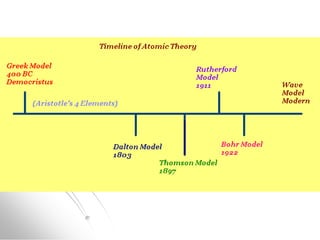 The document traces the history of atomic models from ancient Greek philosophers to modern quantum mechanics. It describes key experiments and findings that led scientists like Dalton, Thomson, Rutherford, Bohr, and Schrödinger to develop successively more accurate models of the atom. Dalton proposed atoms as indivisible particles, Thomson discovered electrons within the atom, Rutherford found the dense nucleus through gold foil experiments, Bohr incorporated electron orbits, and Schrödinger introduced the wave-like electron cloud model still used today.