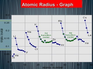 The document discusses atomic size and radius, which is defined as the distance between the nucleus and the outermost shell of an atom. It notes that atomic radii follow two trends - decreasing from left to right within periods and increasing from top to bottom within groups on the periodic table.