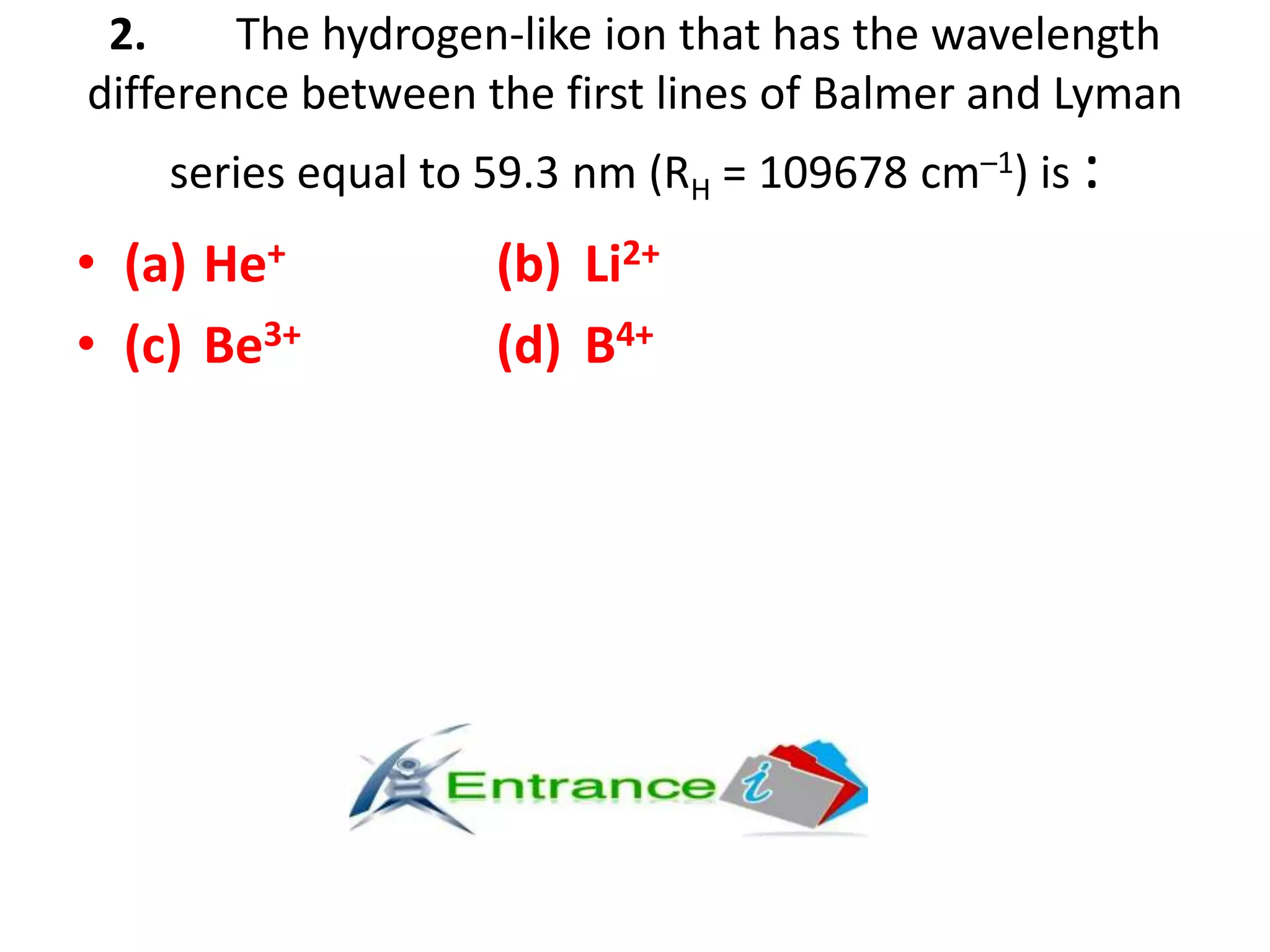 The document presents a series of questions and calculations related to atomic physics, focusing on concepts like ionization energies, spectral lines, and quantum mechanics within hydrogen and hydrogen-like ions. It includes multiple-choice questions and subjective problems requiring calculations related to photon energy, electron transitions, and atomic orbitals. The content targets a deeper understanding of atomic structure and behavior as described by Bohr's model and other quantum theories.