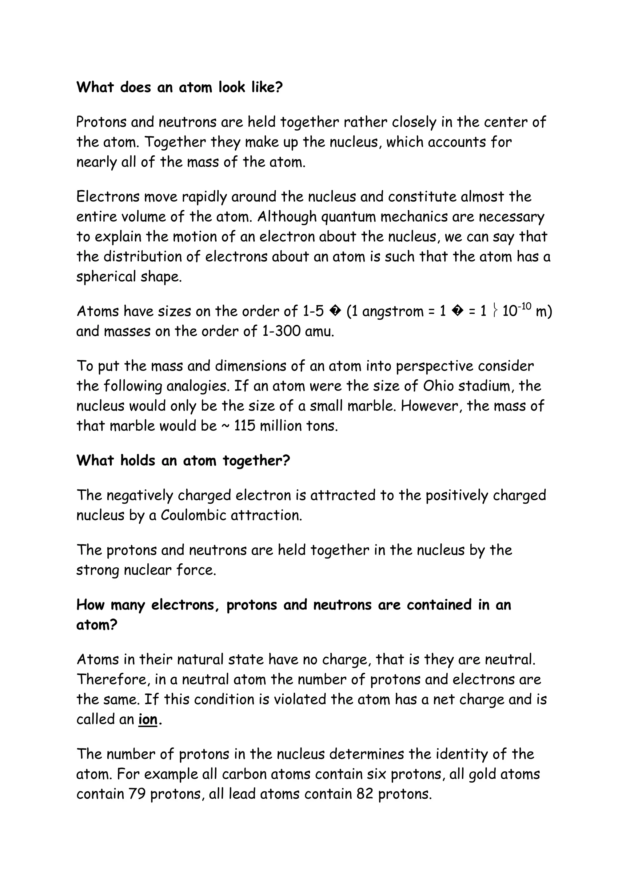 Protons and neutrons make up the tiny, dense nucleus at the center of the atom, accounting for nearly all of its mass. Electrons orbit rapidly around the nucleus and take up nearly the entire volume of the atom. The number of protons determines the identity of an element, while neutrons distinguish between isotopes of that element. Chemical properties depend on the number of protons and electrons. The mass and radioactive properties depend on the total number of protons and neutrons in the nucleus.