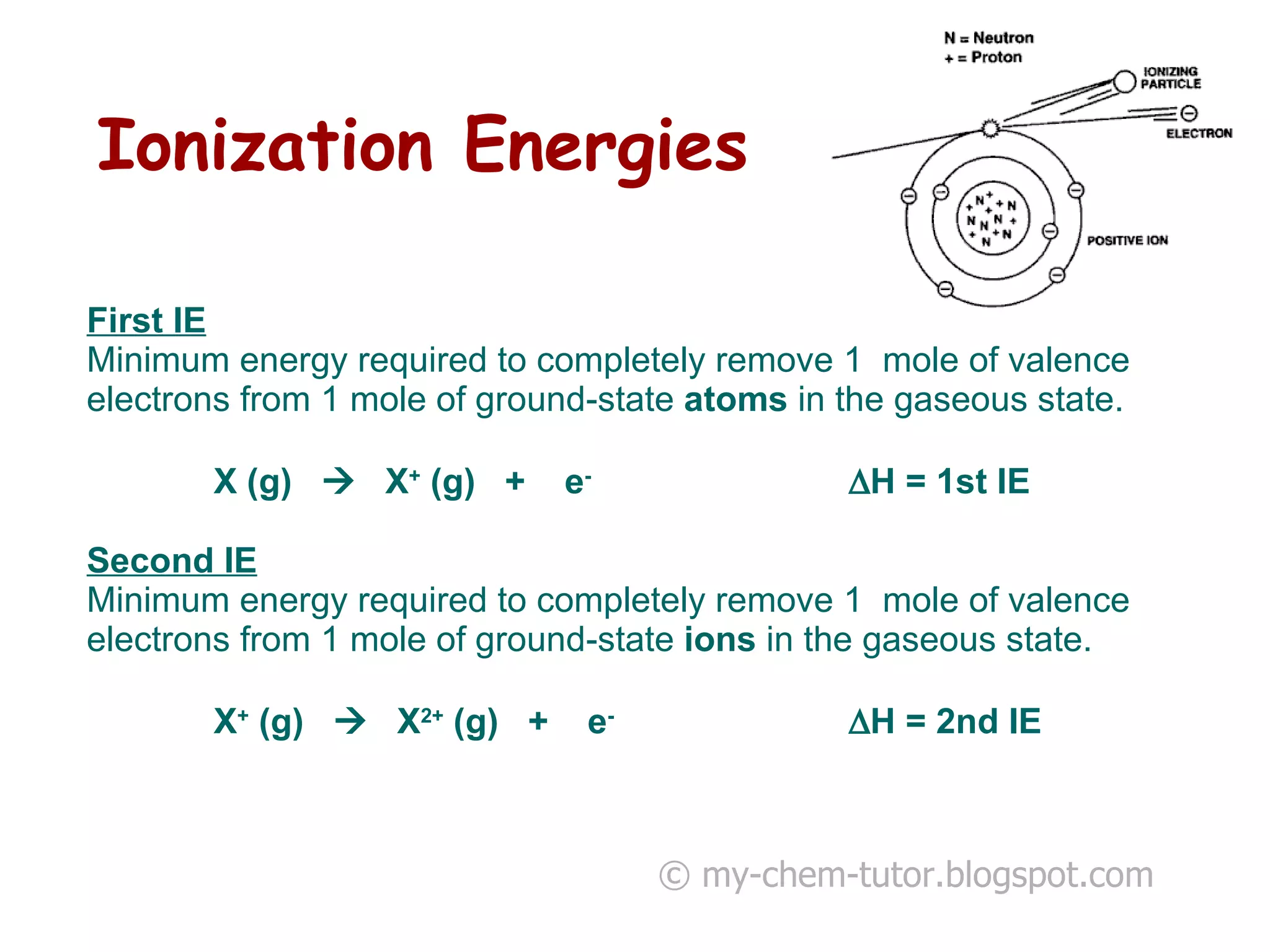 2) General trends in IEs include them decreasing down a group as atomic radius increases, and increasing across a period as nuclear charge increases.