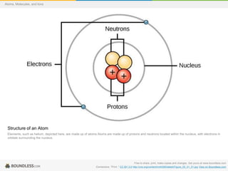 The document discusses the structure of atoms including: