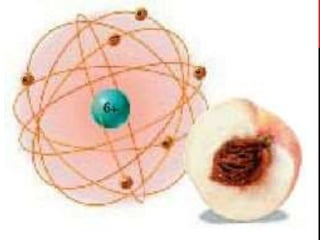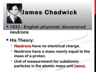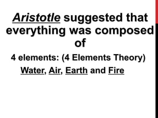 Chemistry began with Aristotle's idea that all matter was made of four elements. Democritus later suggested that matter was made of indivisible particles called atoms. In the 1800s, John Dalton developed the atomic theory stating that all matter is made of atoms that are identical within an element. At the turn of the 20th century, scientists discovered atoms are made of even smaller parts including positively charged protons and negatively charged electrons. Rutherford discovered the nucleus at the center of the atom with electrons orbiting outside. Bohr then proposed electrons orbit in distinct energy levels like planets around the sun. Isotopes with different neutron numbers but the same element were later identified.