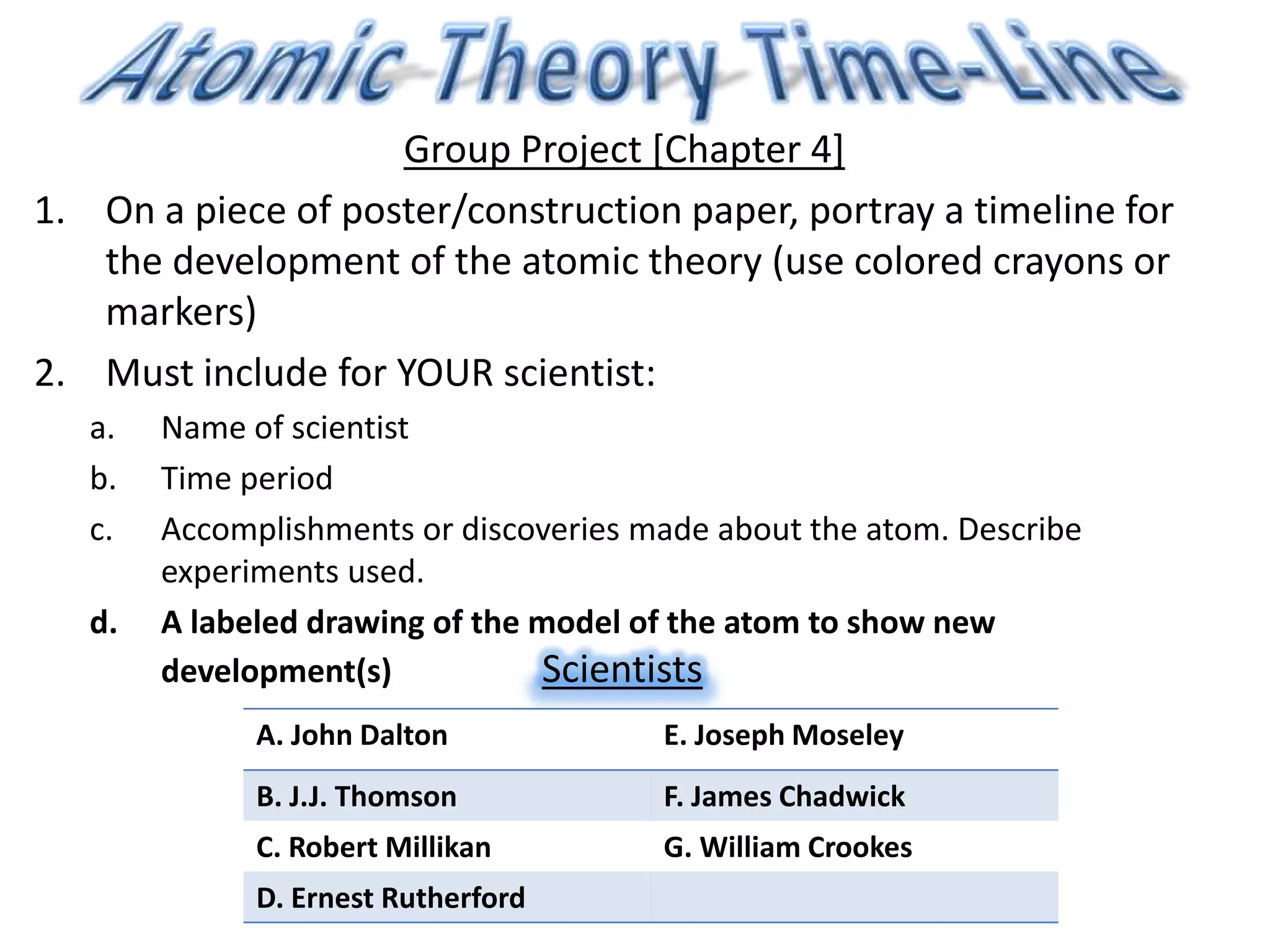 The document provides instructions for a group project to create a timeline portraying the development of atomic theory. Students must include the name, time period, accomplishments and discoveries about atoms, including any experiments used, as well as a labeled drawing of the atomic model, for at least one of the following scientists: John Dalton, J.J. Thomson, Robert Millikan, Ernest Rutherford, Joseph Moseley, James Chadwick, or William Crookes.