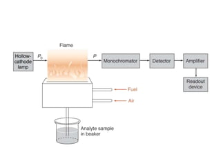 Atomic absorption spectroscopy is an analytical technique that measures the concentration of elements by using the absorption of light by ground state atoms. It works by vaporizing samples using a flame or furnace and passing light from a hollow cathode lamp of the element of interest through the vapor. The amount of light absorbed is measured and the concentration is determined using a calibration curve. Atomic emission spectroscopy similarly uses high temperatures to excite sample atoms, which then emit light of element-specific wavelengths that is measured to determine concentration. Both techniques use similar instrumentation including a light source, atomizer, monochromator, and detector.
