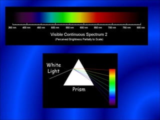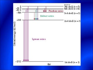 Electrons and light have both wave-like and particle-like properties. Experiments in the early 1900s showed that electrons can behave like waves and light can behave like particles. This led to the development of quantum physics and models of atomic structure. The quantum model of the atom describes electrons as existing in orbitals or probability clouds around the nucleus rather than defined orbits. Electrons can only occupy certain allowed orbitals and jump between these orbitals, emitting or absorbing photons of light. The energy and wavelength of these photons correspond to the spacing between orbitals and make up the characteristic line spectra of elements.