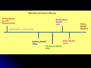 The document traces the development of atomic theory over time from ancient Greek philosophers to modern models. It describes Democritus' idea that matter is made of indivisible particles called "atomos", Dalton's model of atoms as indivisible spheres, Thomson's "plum pudding" model with electrons scattered in a positively charged substance, Rutherford's gold foil experiment showing atoms are mostly empty space with a dense nucleus, Bohr's model of electrons in specific energy levels orbiting the nucleus like planets, and the modern wave model where electrons exist as probability clouds rather than definite orbits.