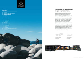 1. Atomos produces field monitor-recorders that allow video professionals to record directly from camera sensors to formats like Apple ProRes and Avid DNxHR on affordable HDD/SSD media. Their devices also function as professional monitors, playback devices, and basic editing tools.