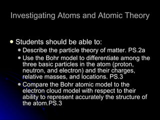 The document traces the development of atomic theory over time from ancient Greek philosophers to modern models. It describes Democritus' idea that matter is made of indivisible particles called "atomos", Dalton's atomic theory of elements composed of atoms, J.J. Thomson's "plum pudding" model showing atoms contain smaller particles, Rutherford's gold foil experiment proving atoms have a small, dense nucleus, Bohr's model of electrons in specific energy levels orbiting the nucleus, and the modern wave model showing electrons as probability clouds rather than definite orbits.
