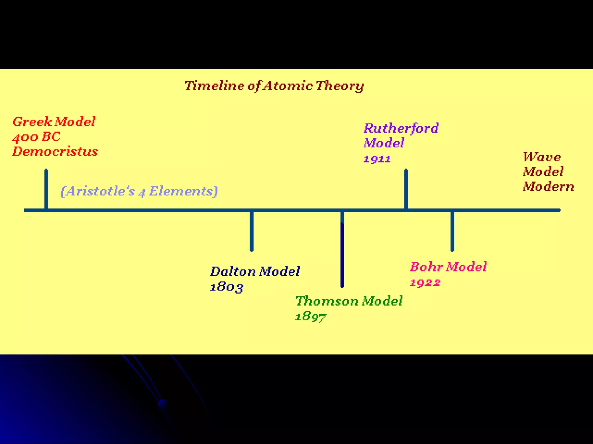 The document traces the development of atomic theory over time from ancient Greek philosophers to modern models. It describes Democritus' idea that matter is made of indivisible particles called "atomos", Dalton's atomic theory of elements composed of atoms, J.J. Thomson's "plum pudding" model showing atoms contain smaller particles, Rutherford's gold foil experiment proving atoms have a small, dense nucleus, Bohr's model of electrons in specific energy levels orbiting the nucleus, and the modern wave model showing electrons as probability clouds rather than definite orbits.
