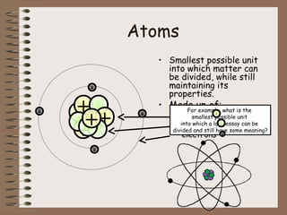 The document discusses the basic building blocks of matter at the atomic level. It explains that atoms are made up of protons, neutrons, and electrons. Protons are positively charged and found in the atom's nucleus along with neutrons, which have no charge. Electrons are negatively charged and orbit the nucleus. It provides examples of hydrogen, oxygen, and sodium atoms, showing their proton, neutron, and electron composition. The atomic number is the number of protons, while the mass number includes protons and neutrons. Atoms can gain or lose electrons to become ions that are electrically charged.