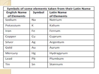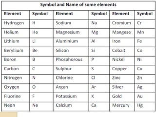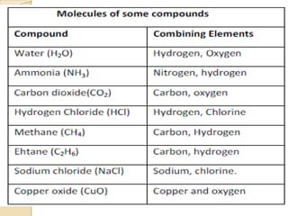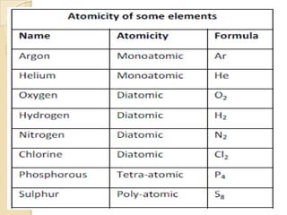 This document discusses the history and development of atomic theory. It describes how ancient Indian and Greek philosophers first proposed that matter is divisible into smaller particles. Democritus named these indivisible particles "atoms." Later, scientists like John Dalton and Antoine Lavoisier established laws of chemistry, including the law of conservation of mass and the law of constant proportions, which supported the atomic theory. Dalton further proposed that elements are made of atoms that combine in whole number ratios. The document defines key concepts like molecules, ions, chemical formulas, and moles. It provides examples of atomic structure and molecular formulas of common compounds.