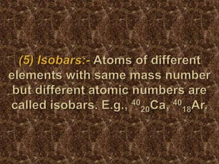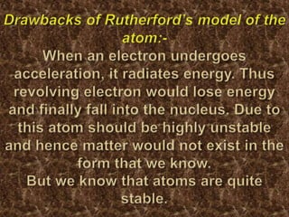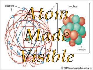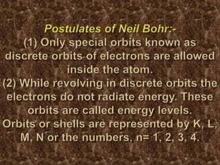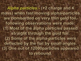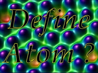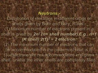 This document provides information about the structure and composition of atoms. It discusses the discovery of subatomic particles like electrons, protons and neutrons through the models of Thomson and Rutherford. It explains that atoms are very small, around 10-10 meters, and describes the shells and number of electrons in the K, L, M and N shells. Tables listing common elements and their symbols are included. The document also defines molecules as groups of atoms bonded together, and provides examples of monoatomic and diatomic molecules like hydrogen, oxygen and ozone. It introduces the concept of ions as charged particles in compounds.